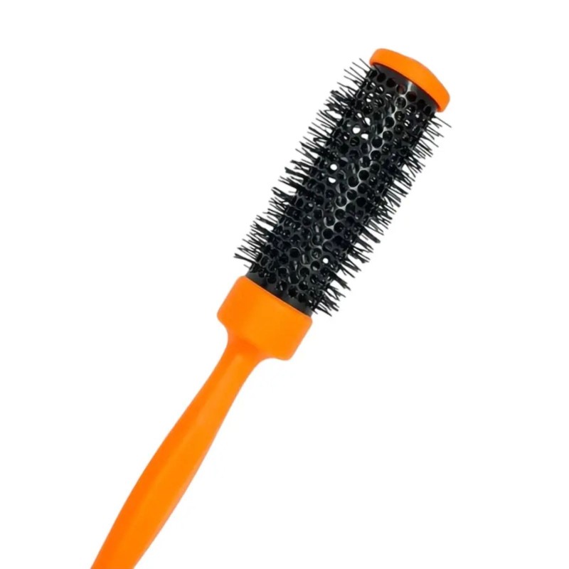Spazzola professionale in nylon con manico arancione fluo, diametro 48 mm e tubo ceramico da 32 mm. Volume e styling luminoso in un solo gesto.